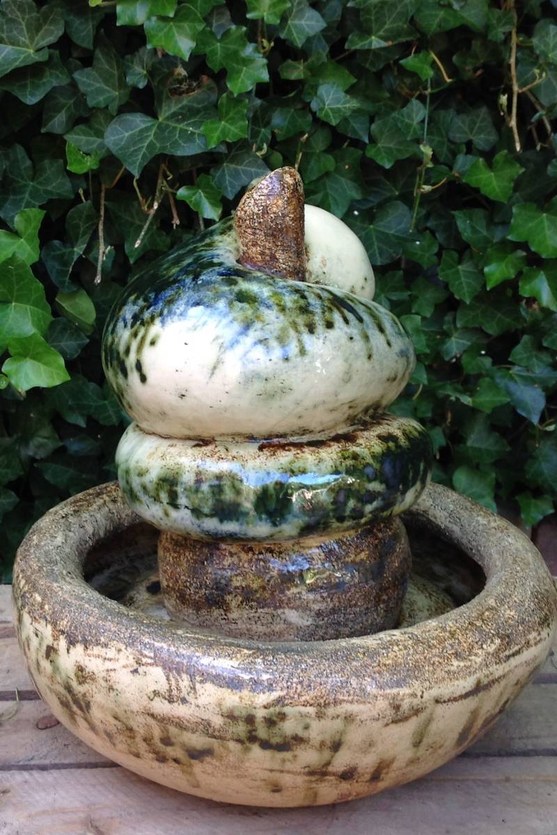 Stromend water in de tuin geeft rust. Al mijn waterobjecten stromen op zonne-energie, waardoor het water stroomt als de zon schijnt, maar stopt met stromen als deze achter de wolken verdwijnt. Met al je zintuigen ervaar je hierdoor de zon, door het licht in je ogen, ervaring van warmte op je huid, maar nu ook door het geklater van het water dat je hoort.